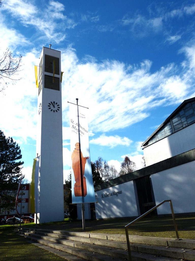 Die Pfarrkirche St. Albertus Magnus wurde 1963 geweiht. Sie trägt den Namen des Kirchenlehrers Albertus Magnus. Der „kosmische Christus“ über dem Altar und die monumentale Figur des Kirchenpatrons prägen den Innenraum.